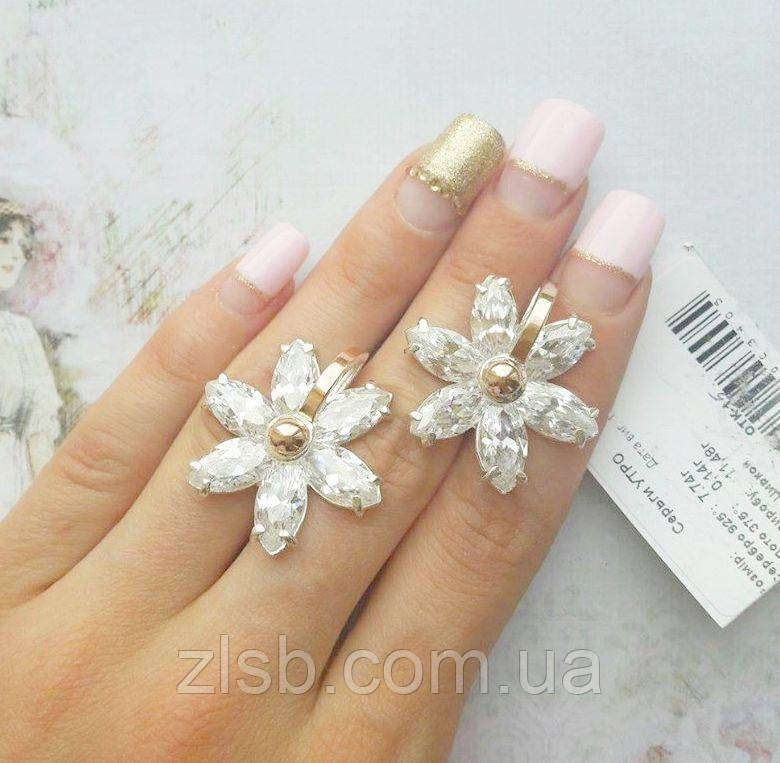 Сережки у формі квітки з білими цирконами і золотом Ранок, серебро 925 пробы